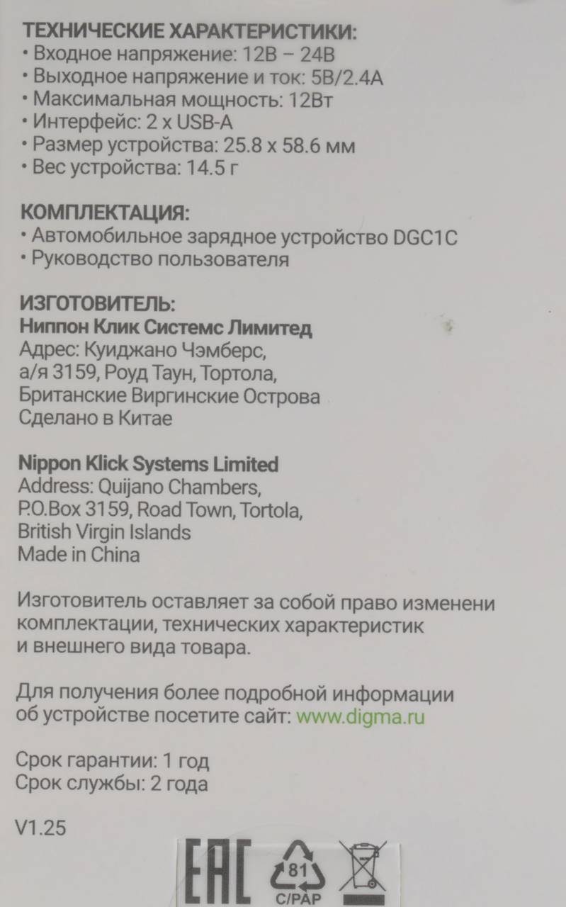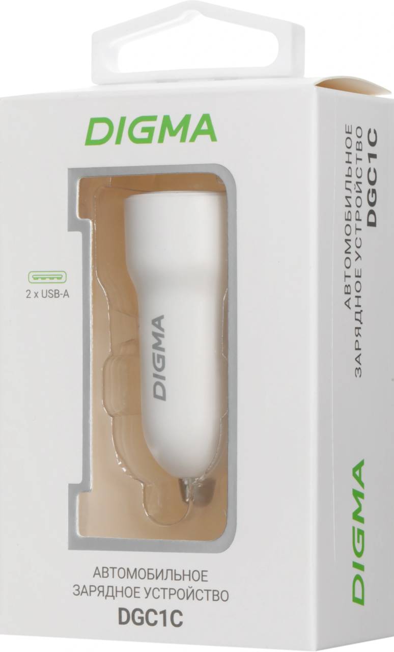 Автомобильная зарядка для устройств Digma Автомобильное зар./устр. DGC1С 12W 2.4A 2xUSB белый