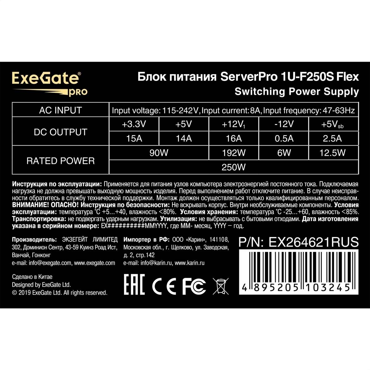 Серверный блок питания EXEGATE EX264621RUS Серверный БП 250W <ServerPRO-1U-F250S>, унив. для Flex1U, 24pin, 4pin,3xSATA, 2xIDE