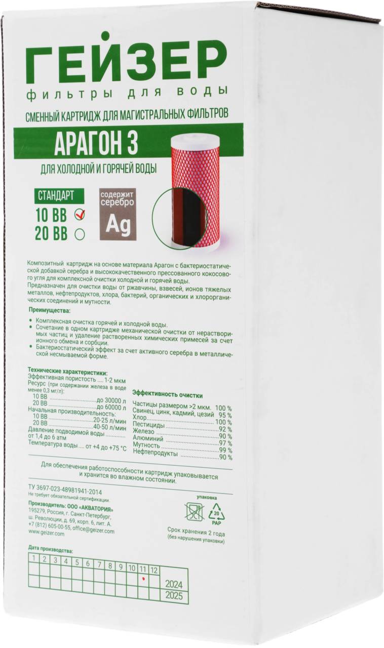 Фильтр для воды Гейзер Картридж Арагон 3 10ВВ для проточных фильтров ресурс:30000л