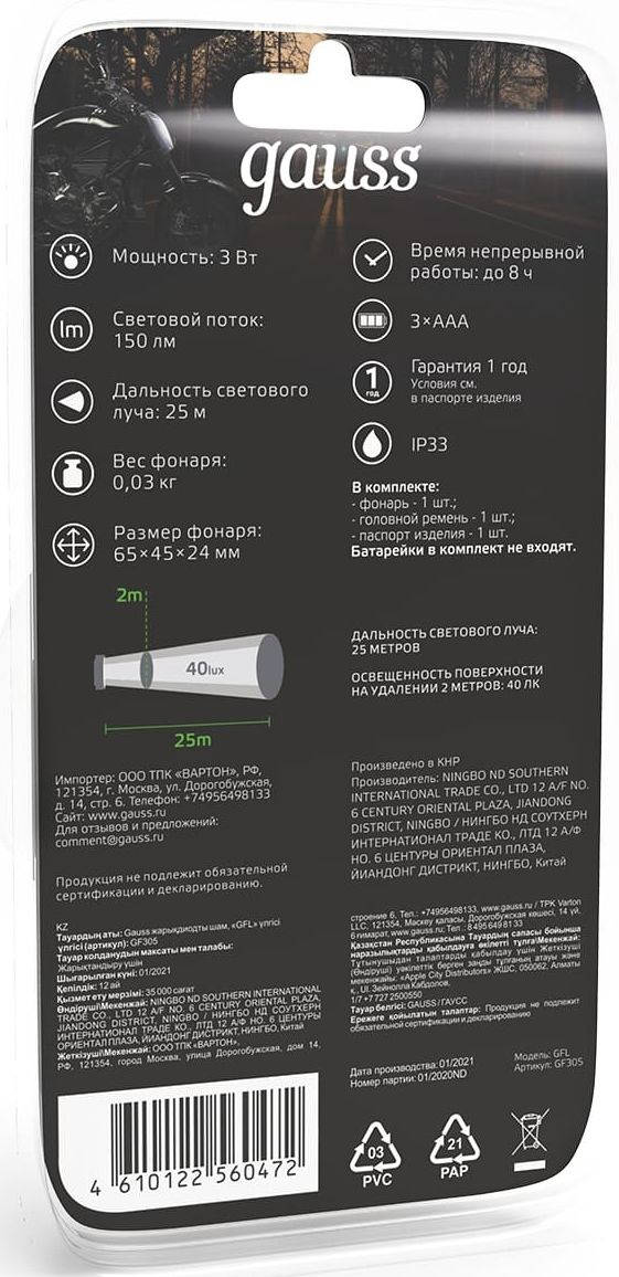 Фонарь GAUSS налобный GFL305 черный (GF305)