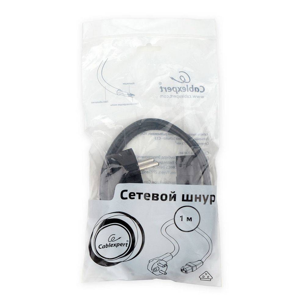 Кабель питания Cablexpert PC-186-VDE-1M 1м, Schuko- C13, VDE, 10А, черный, с заземлением, пакет