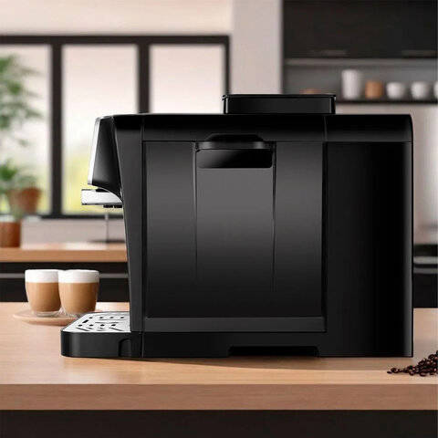 Удобная панель управления с дисплеем делает выбор режимов интуитивно понятным. В комплекте есть подставка для чашек, а съёмный поддон для капель с поплавком сигнализирует о необходимости опорожнения. Резервуар для воды — 1,5 л, контейнер для зёрен — 200 г, что достаточно для нескольких дней использования. Мощность устройства — 1480 Вт, уровень шума — до 70 дБ, длина шнура — 1 м, а отсек для хранения шнура расположен на дне корпуса.