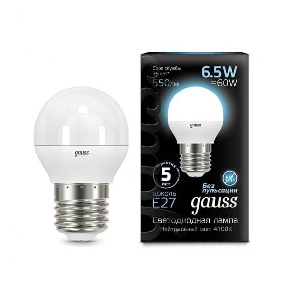 Лампа GAUSS светодиодная 6.5Вт цок.:E27 шар 220B 4100K св.свеч.бел.ней. P45 (105102207)