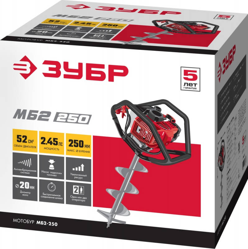 Мотобур ЗУБР МБ2-250 профес. 2-х такт. 1800Вт 2.45л.с. 52см3 8800об/мин