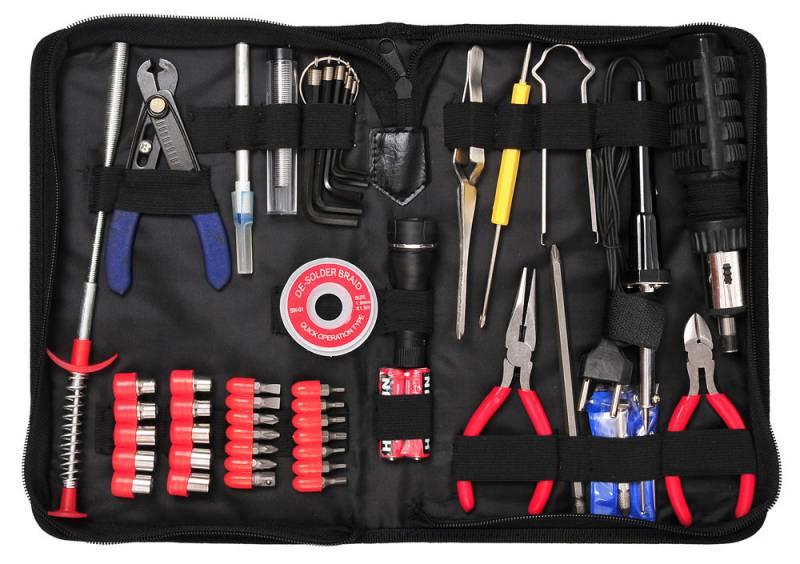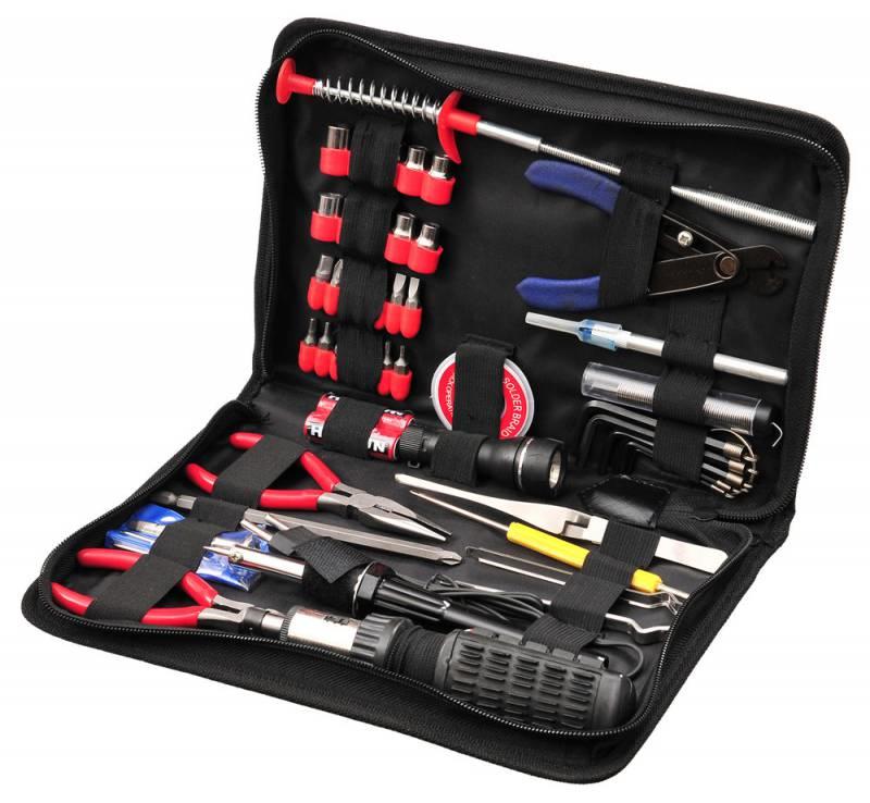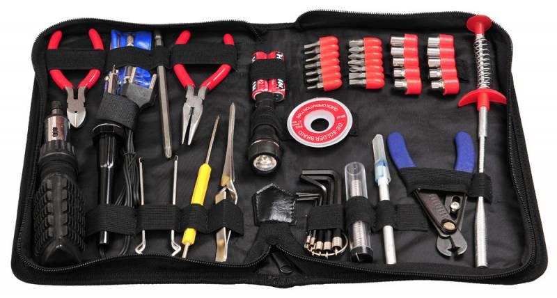 Описание:Реверс. отвертка с 14 жалами и 10 торц. ключами. Пассатижи 135мм. Кусачки 120мм. Часовая отвертка с 5 жалами. Отвертка с 2 жалами: 70х3 прямое и 20х3 крестовое. Пинцет. Шестигранные ключи. Экстрактор для микросхем. Паяльник. Припой. Фитиль для припоя. Зацеп. Инструмент для разделки кабеля. Скальпель