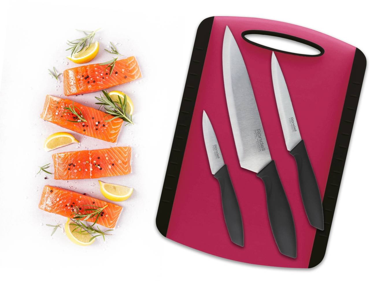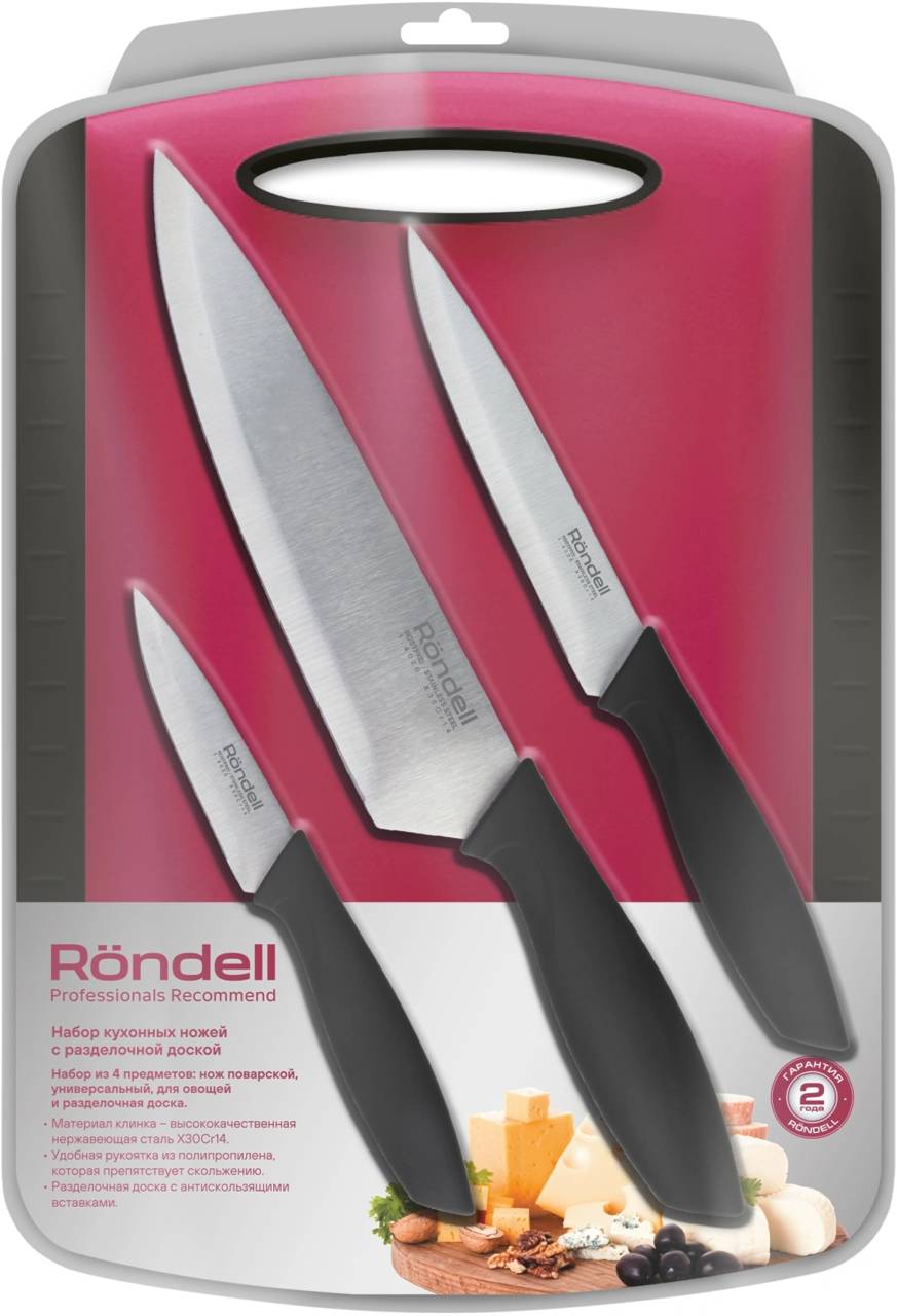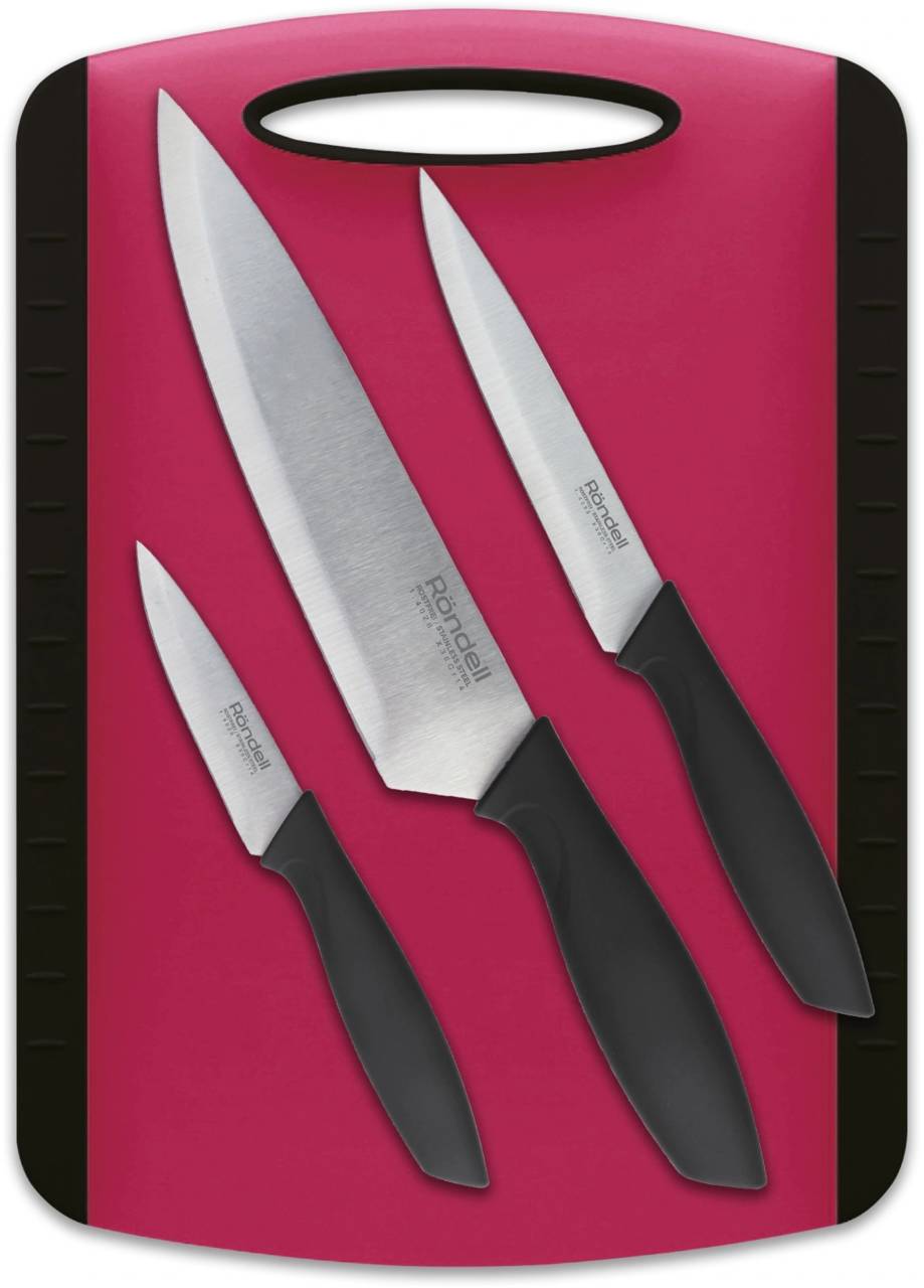 | Состав комплекта: | Нож поварской 20 см, нож универсальный 12 см, нож для овощей 10 см, доска разделочная 34*24*0,8 см |