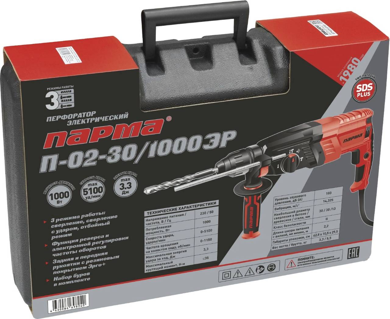 Перфоратор ПАРМА П-02-30/1000ЭР патрон:SDS-plus уд.:3.3Дж 1000Вт