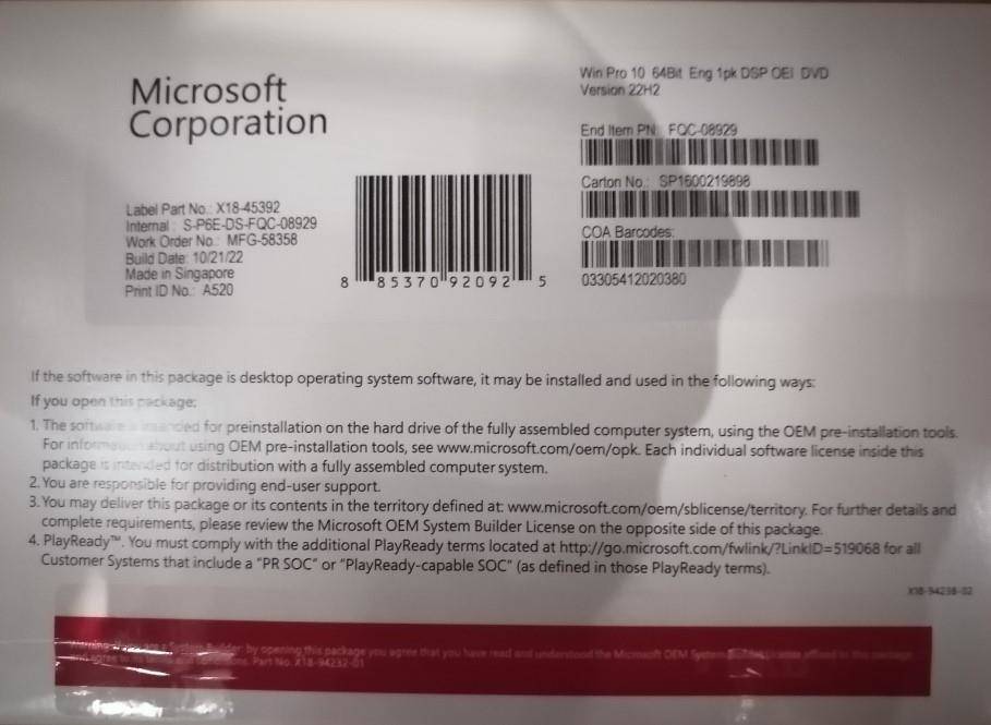 Программное обеспечение Microsoft Лицензия OEM WIN 10 PRO 64B ENG 1PK FQC-08929 MS