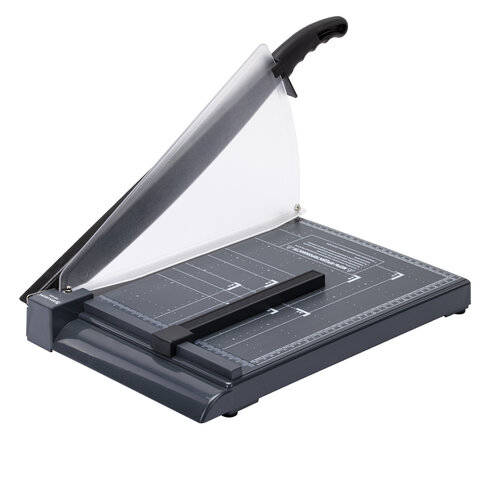 Длина реза составляет 330 мм. Также имеются уголки для форматов А4, B5, А5, B6. Резиновые ножки вкупе с прочным основанием предотвращают скольжение по рабочему столу во время эксплуатации. Размер – 275х294х532 мм. Вес – 1,4 кг.