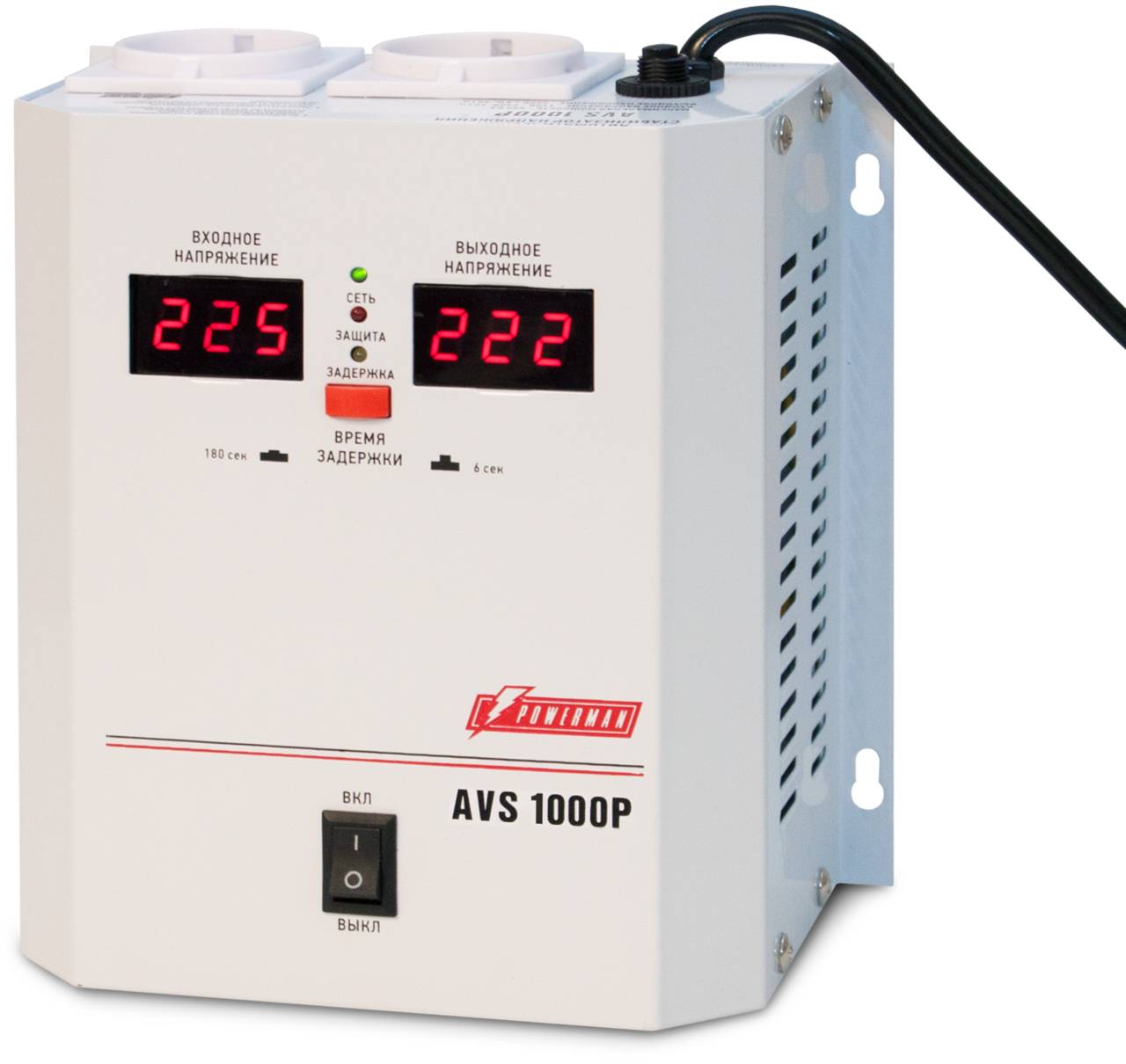 Сетевой стабилизатор PowerMan Stabilizer POWERMAN AVS 1000P, step-type regulator, digital indicators of voltage levels, 1000VA, 110-260V, maximum input current 7A, 2 eurosockets, IP-20, hinged, 185mm x 170mm x 100mm, 3.5 kg. POWERMAN AVS-1000P (POWERMAN AVS-1000P)