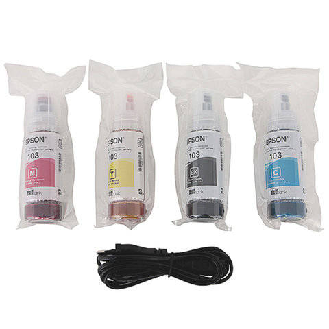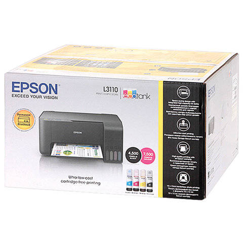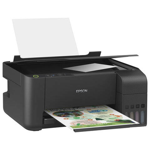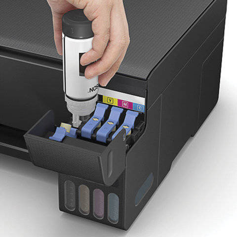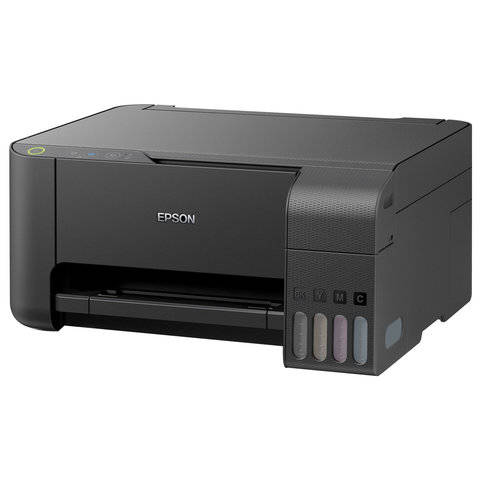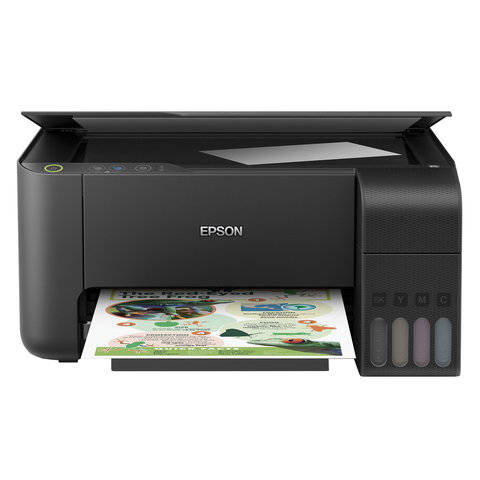 Epson L3110 — это МФУ 3-в-1 (принтер, сканер и копир) нового поколения с фронтальными емкостями для пополнения чернил.