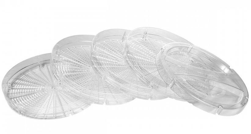 У сушилки Zelmer ZFD1005 сразу 4 уровня на которых можно разместить, фрукты, овощи, грибы или ягоды. Диаметр каждого слоя 32 сантиметра, что позволяет вам вместить на один поддон до 2,5 кг продуктов.