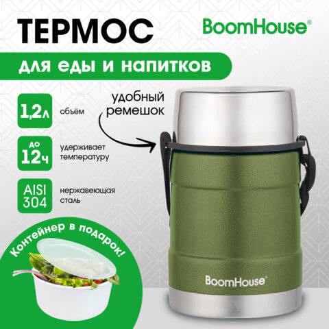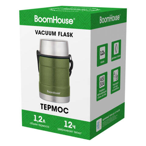 Термос BoomHouse - практичное решение для сохранения температуры еды и напитков до 12 часов! Двойные стенки из нержавеющей стали SUS 304 надёжно удерживают тепло, а широкое горло удобно для первых и вторых блюд. Незаменим в поездках, на работе и отдыхе. Термос BoomHouse выполнен из долговечной пищевой нержавеющей стали SUS 304 и безопасного для здоровья нетоксичного пластика (BPA free). Благодаря качественной вакуумной конструкции с двойными стенками, силиконовым уплотнителям и надежной крышке полностью герметичен и не протекает при использовании. Удержание температуры зависит от условий использования: частота открывания, время нахождения в открытом состоянии, температура окружающей среды, начальная температура наливаемой жидкости.