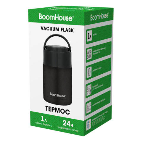 Термос BoomHouse - практичное решение для сохранения температуры еды и напитков до 24 часов! Двойные стенки из нержавеющей стали SUS 304 надёжно удерживают тепло, а широкое горло удобно для первых и вторых блюд. Незаменим в поездках, на работе и отдыхе. Термос BoomHouse выполнен из долговечной пищевой нержавеющей стали SUS 304 и безопасного для здоровья нетоксичного пластика (BPA free). Благодаря качественной вакуумной конструкции с двойными стенками, силиконовым уплотнителям и надежной крышке полностью герметичен и не протекает при использовании. Удержание температуры зависит от условий использования: частота открывания, время нахождения в открытом состоянии, температура окружающей среды, начальная температура наливаемой жидкости.