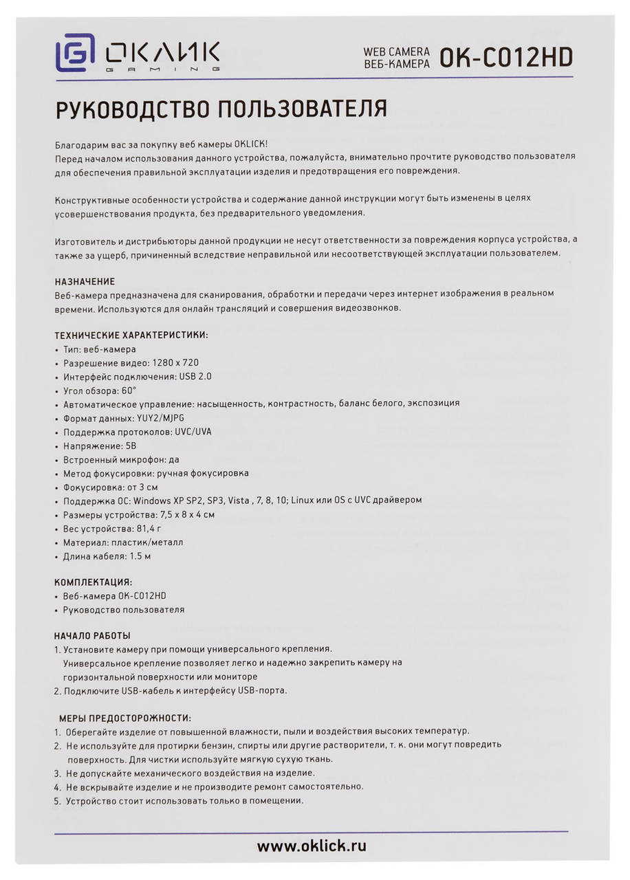 Описание:Веб-камера Oklick Камера Web Оклик OK-C012HD черный 1Mpix USB2.0 с микрофоном