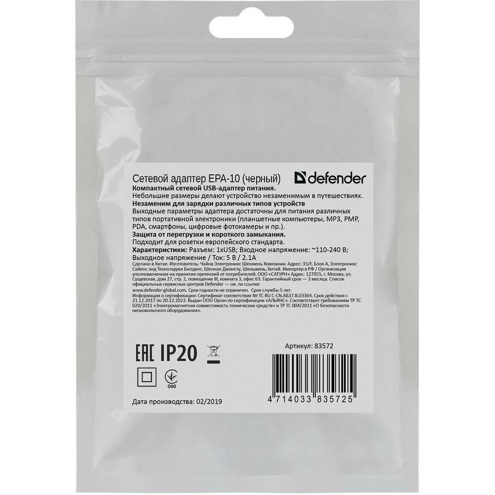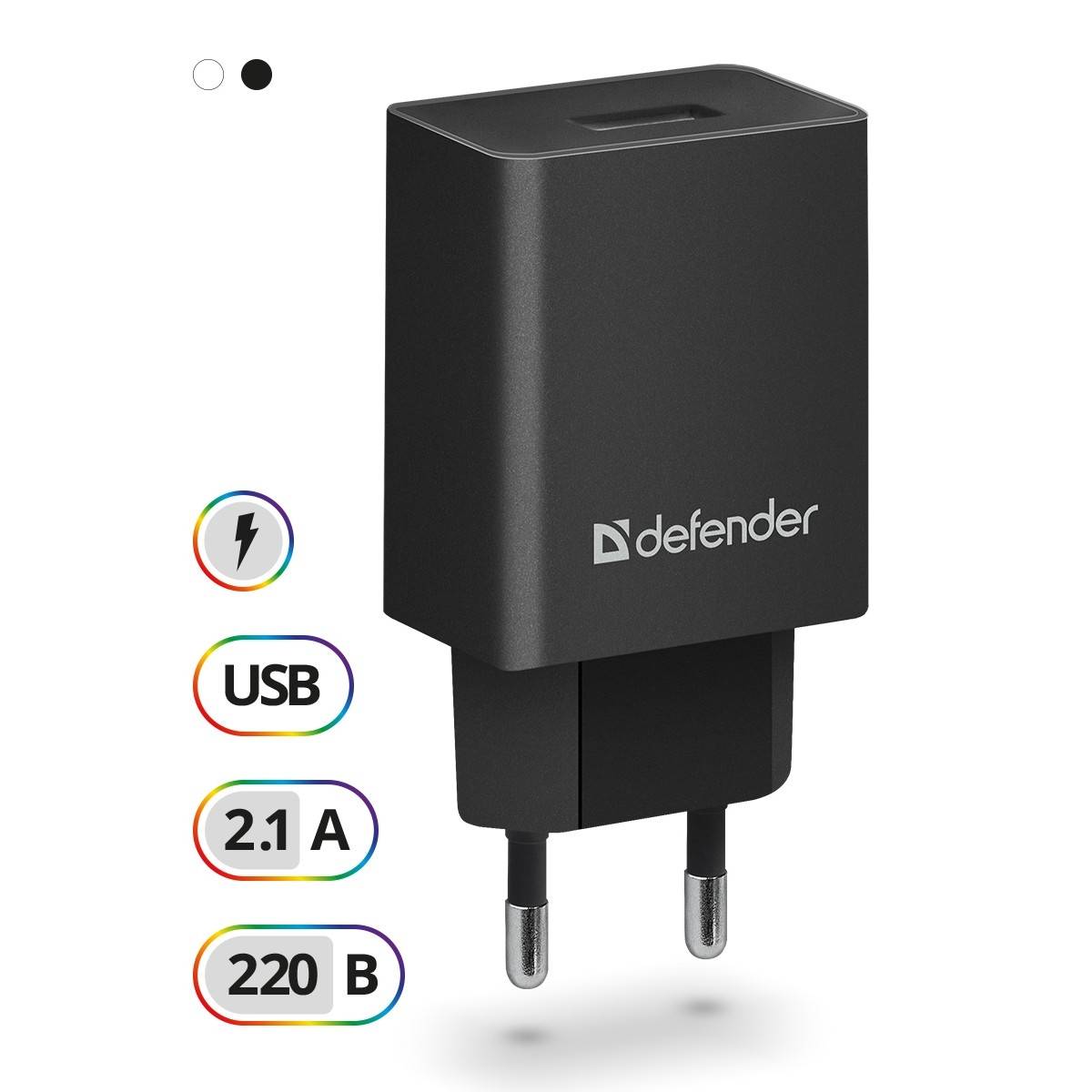 Аккумулятор, ЗУ для устройств DEFENDER Сетевой адаптер 1xUSB, 5V/2.1А, пакет, черный